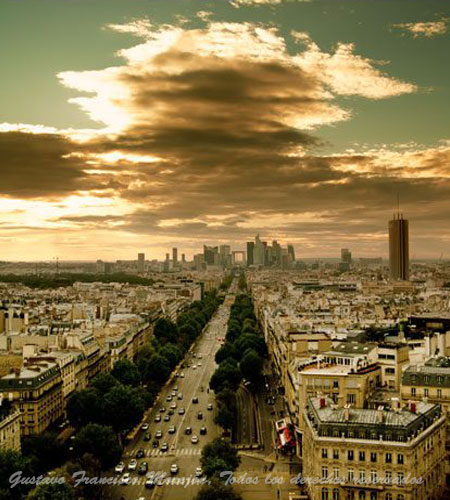 "Vista del Gran Arco de la Defense desde la parte superior del Arco del Triunfo."